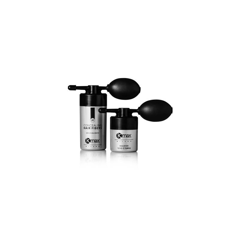 Erogatore a spruzzo Kmax per l'applicazione precisa e naturale delle microfibre di cheratina per nascondere il diradamento di capelli e la calvizie.